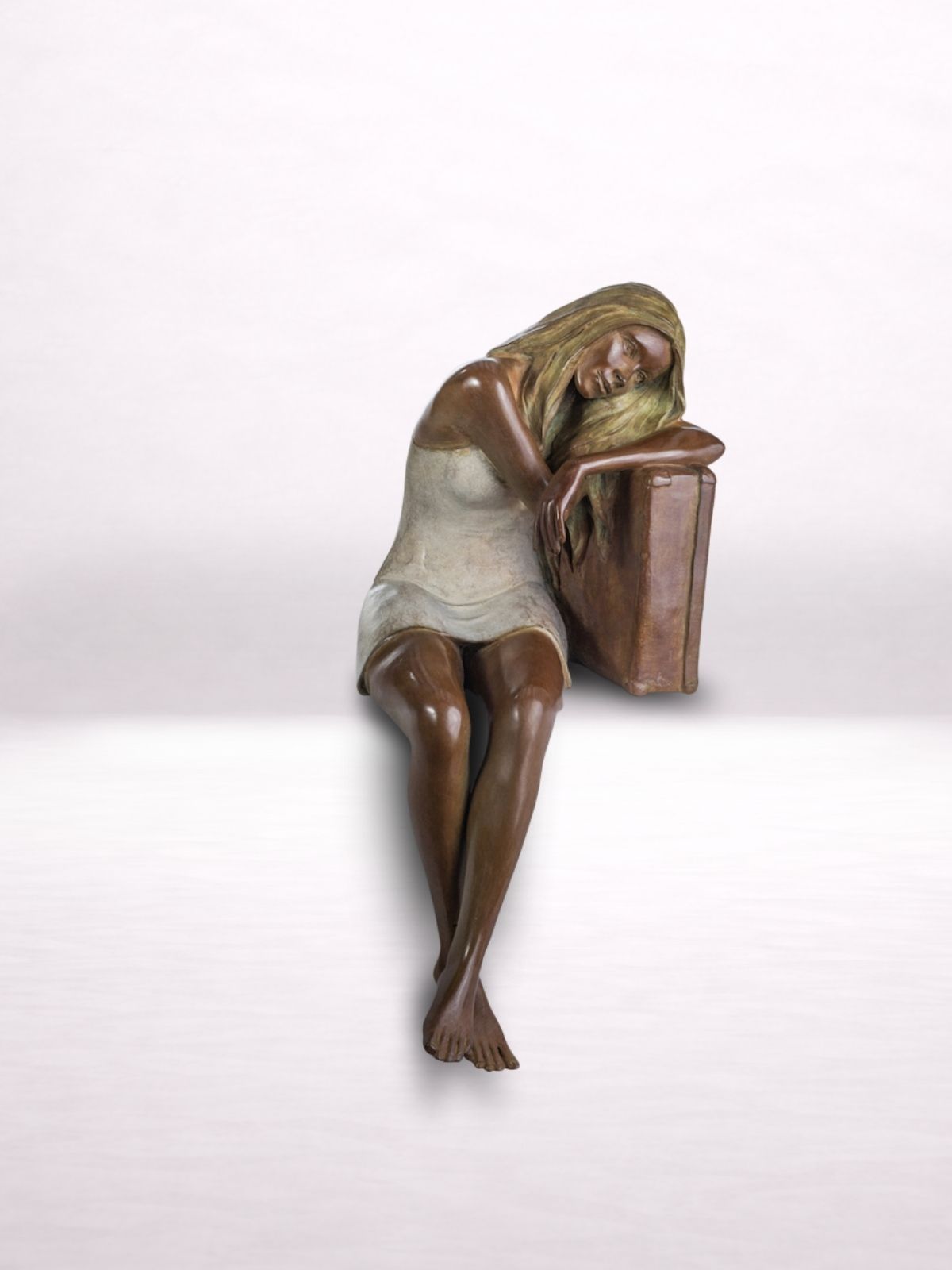 • Sculpture en bronze d’une femme assise appuyée sur une valise, vue de face.