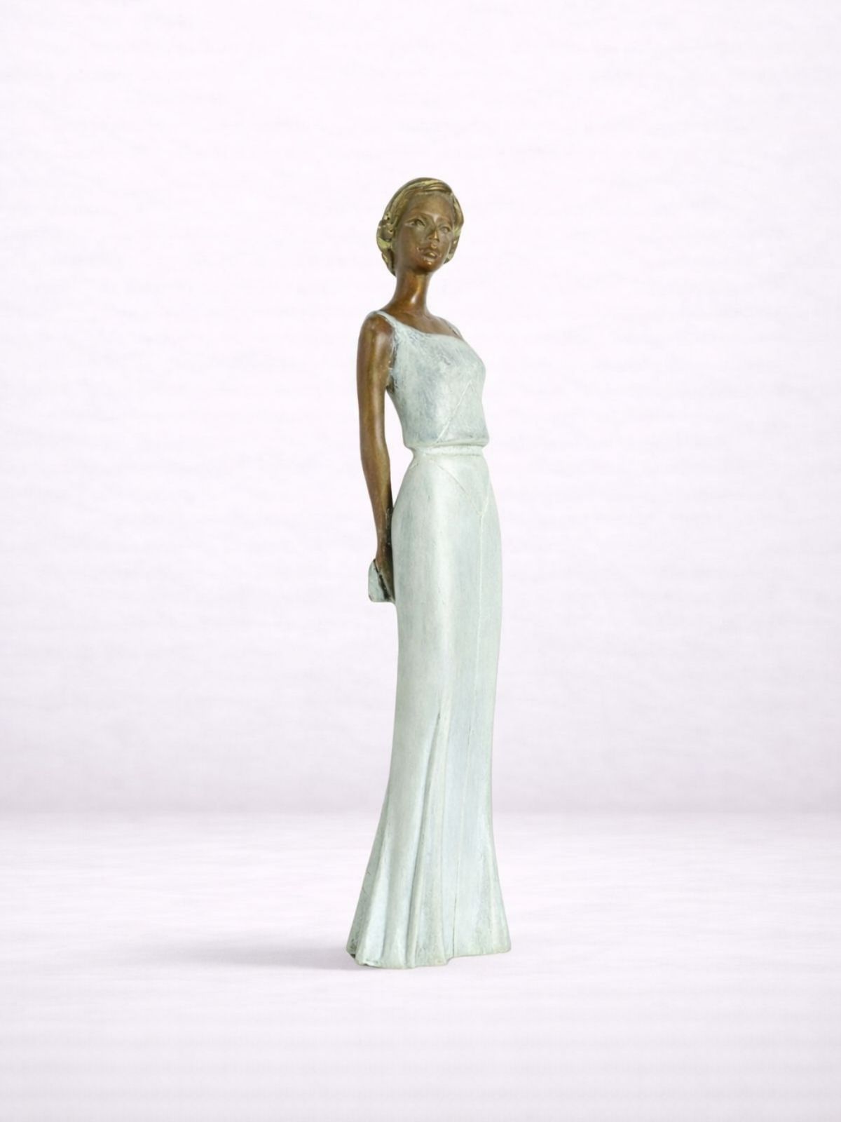 • Sculpture en bronze d’une femme debout en robe longue les bras derrière le dos.