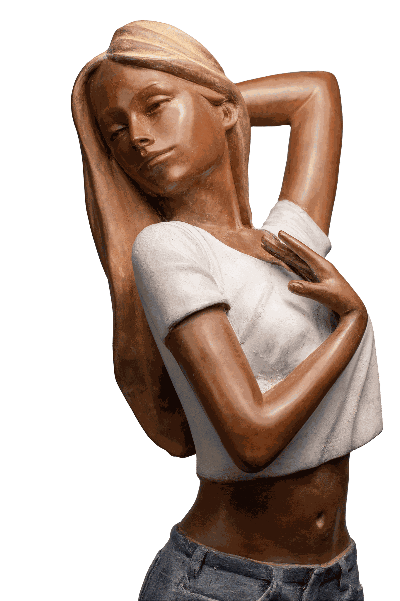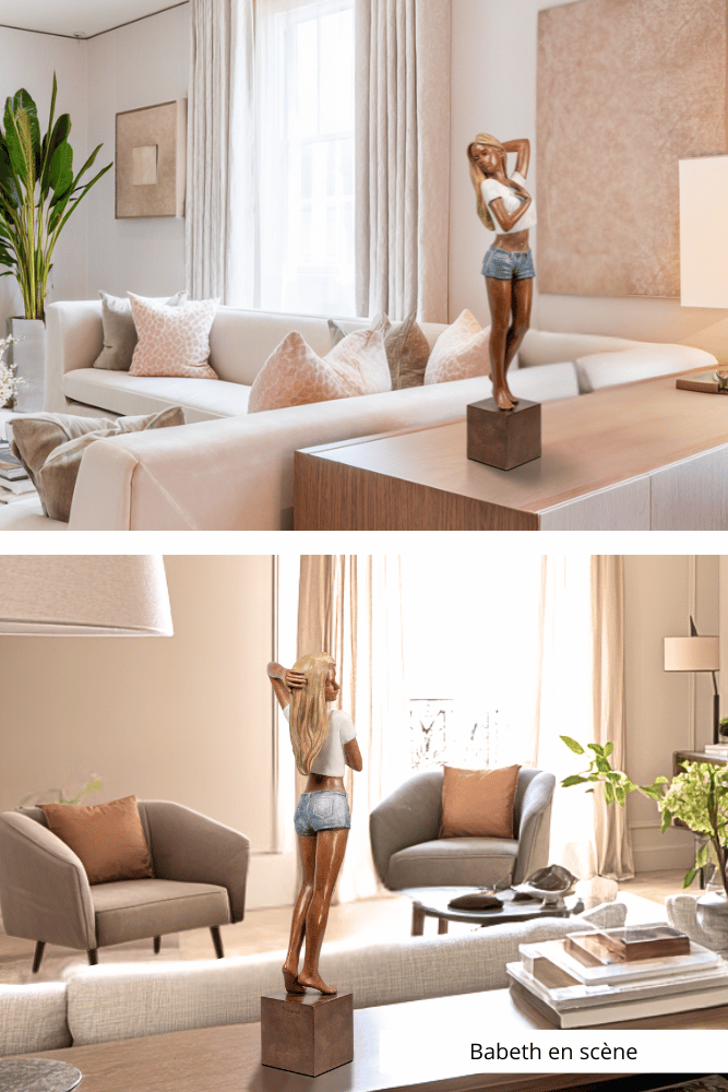 Placée dans un espace de vie, Babeth attire par sa vitalité, sa légèreté. Sa pose, presque dansante, diffuse une énergie joyeuse et contemporaine. Elle s’impose avec naturel, comme une figure libre qui célèbre l'élan de la jeunesse.
