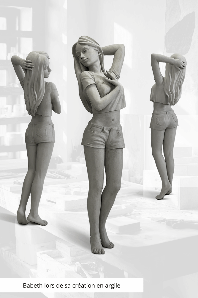 "Lorsque j’ai commencé à façonner cette sculpture dans l’argile, je voulais qu’elle incarne une figure contemporaine : fière, consciente de son attrait, ouverte au regard mais gardant sa distance. Fragile encore à ce stade, elle laissait néanmoins transparaître une énergie intérieure bien affirmée.