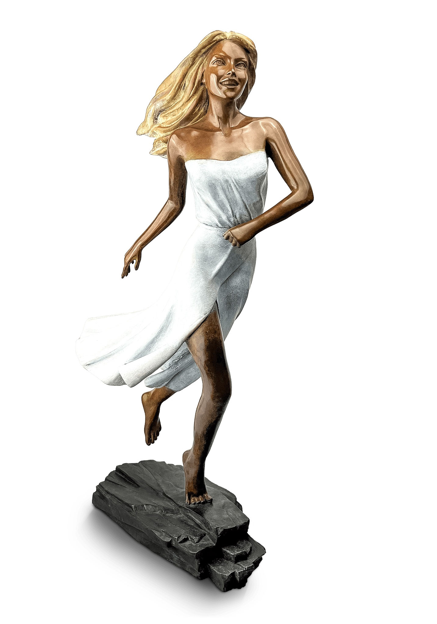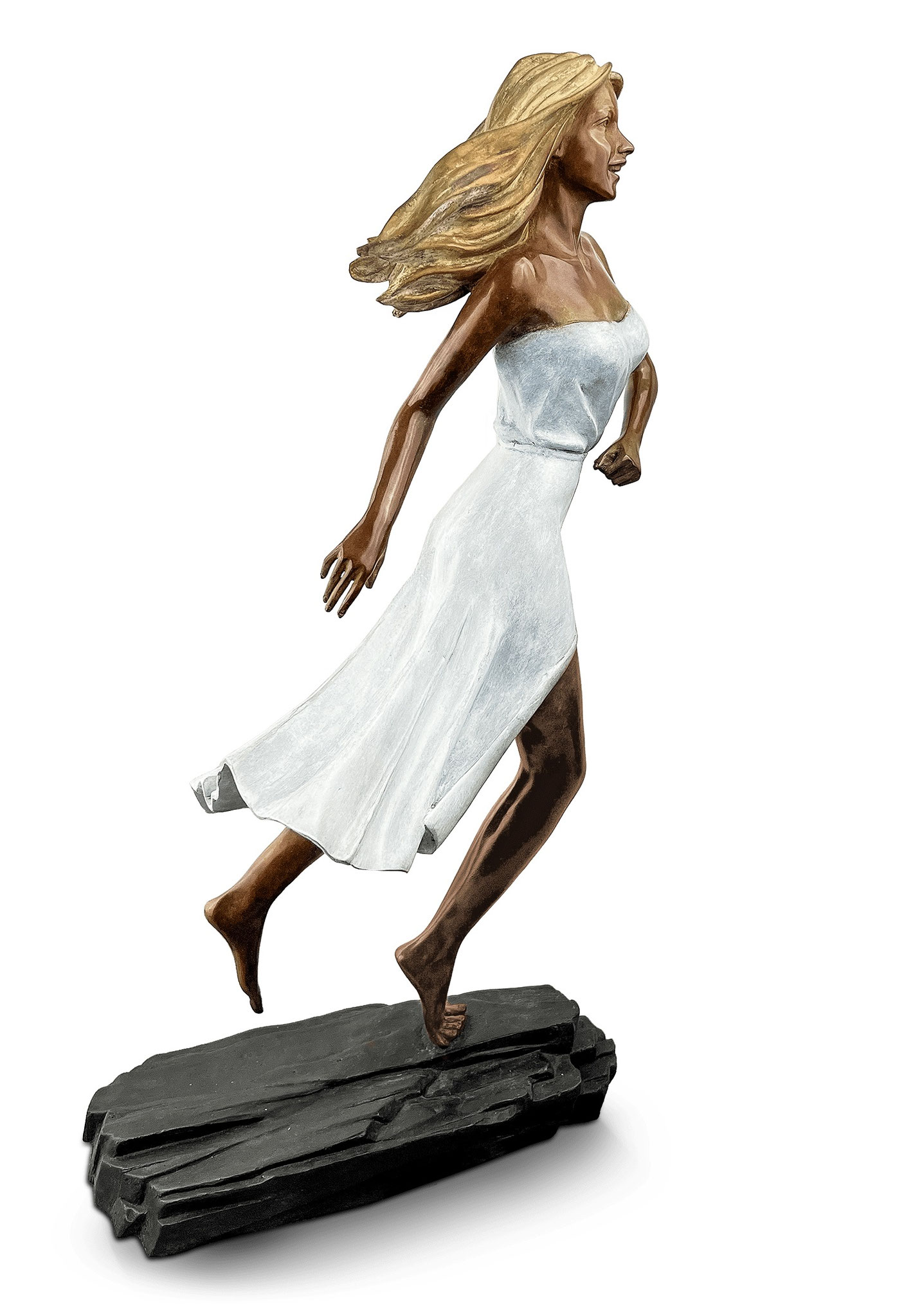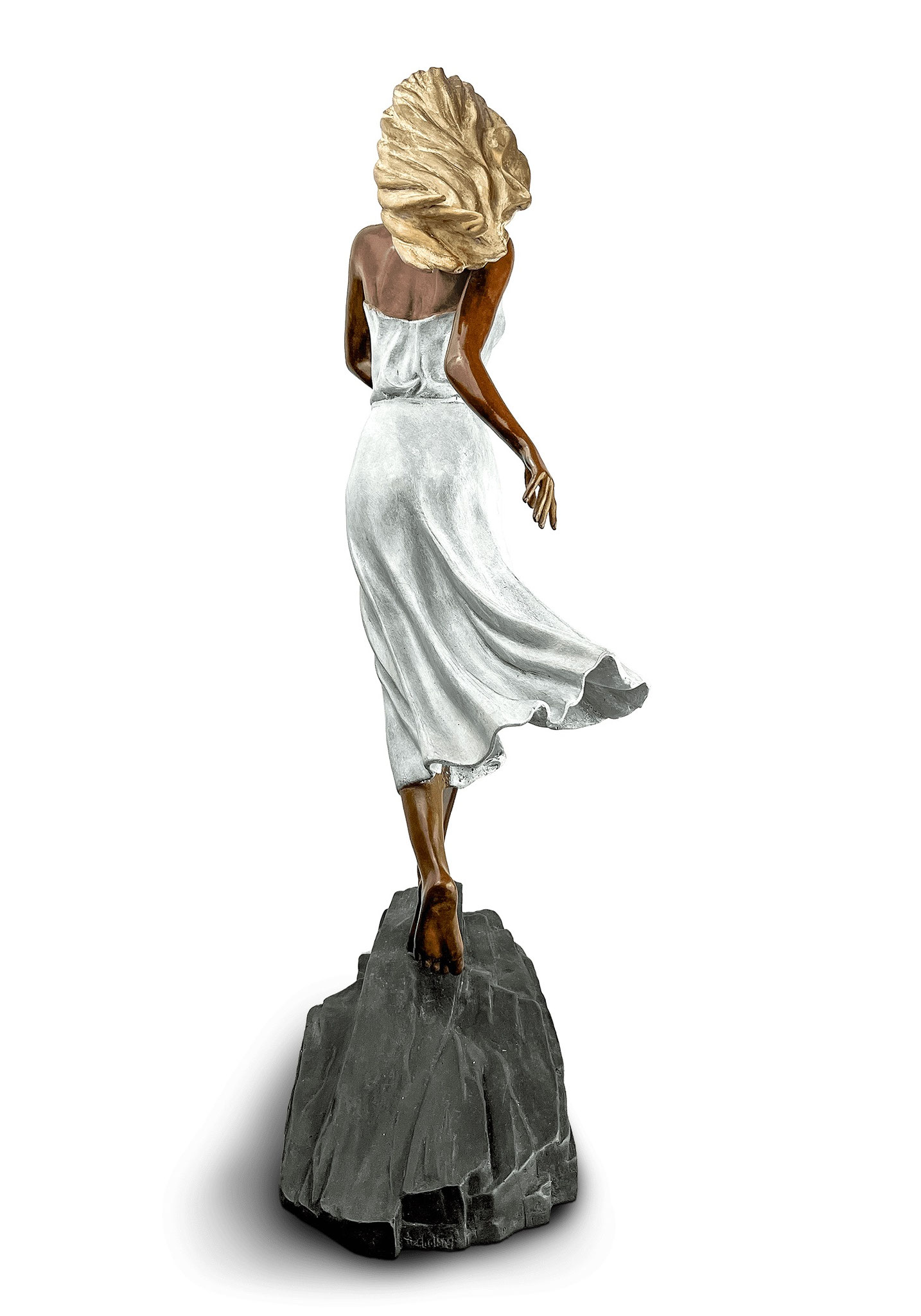 Le passage au bronze a renforcé sa légèreté en donnant au socle l’aspect recherché de la roche d’ardoise. La patine a permit d’amplifier les contrastes : le satin de la robe, la chaleur de la peau, la texture minérale de la pierre." AC