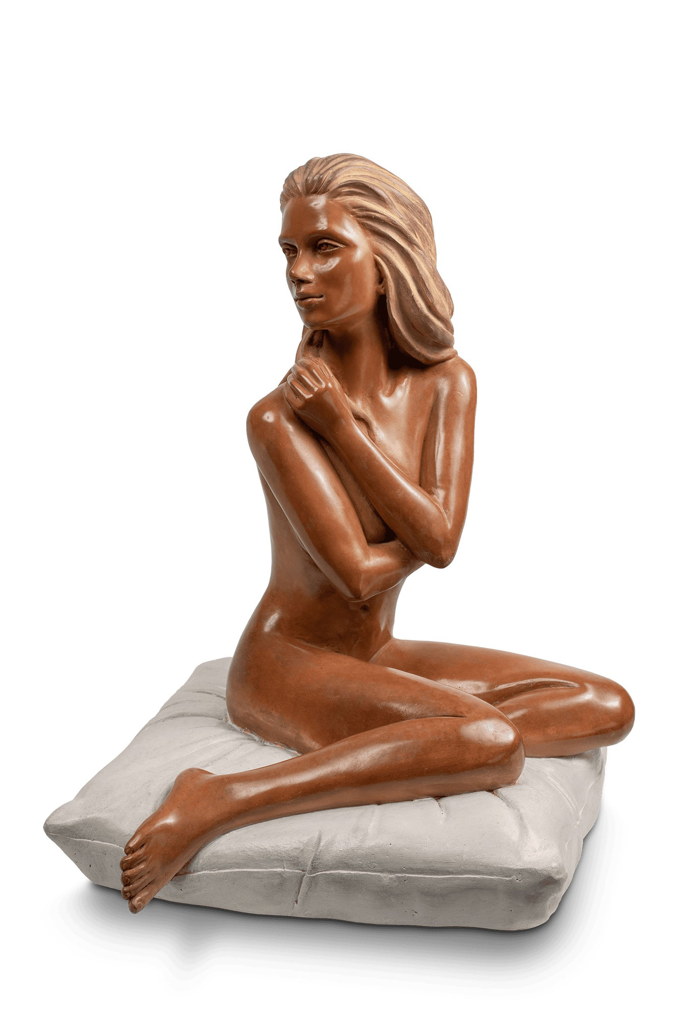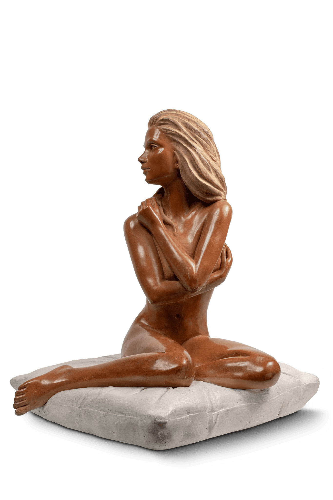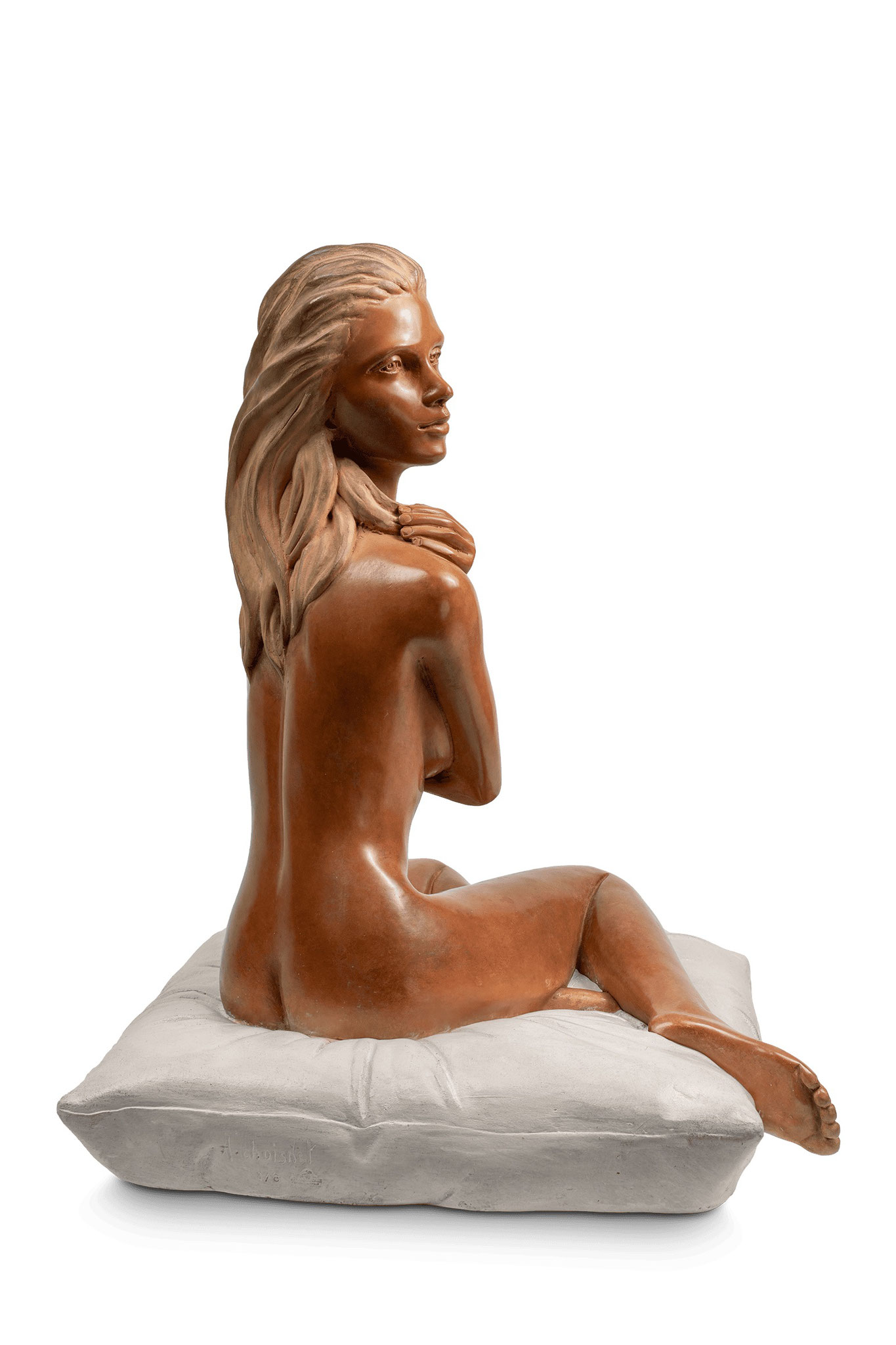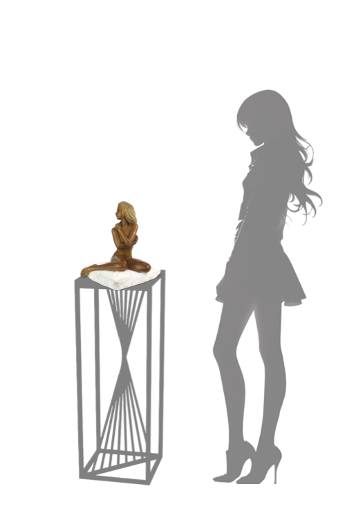 On peut la percevoir mélancolique. Je l'ai voulue bienveillante. Le passage au bronze a amplifié cette présence, préservant à jamais sa douceur compatissante et la profondeur silencieuse de son regard." AC