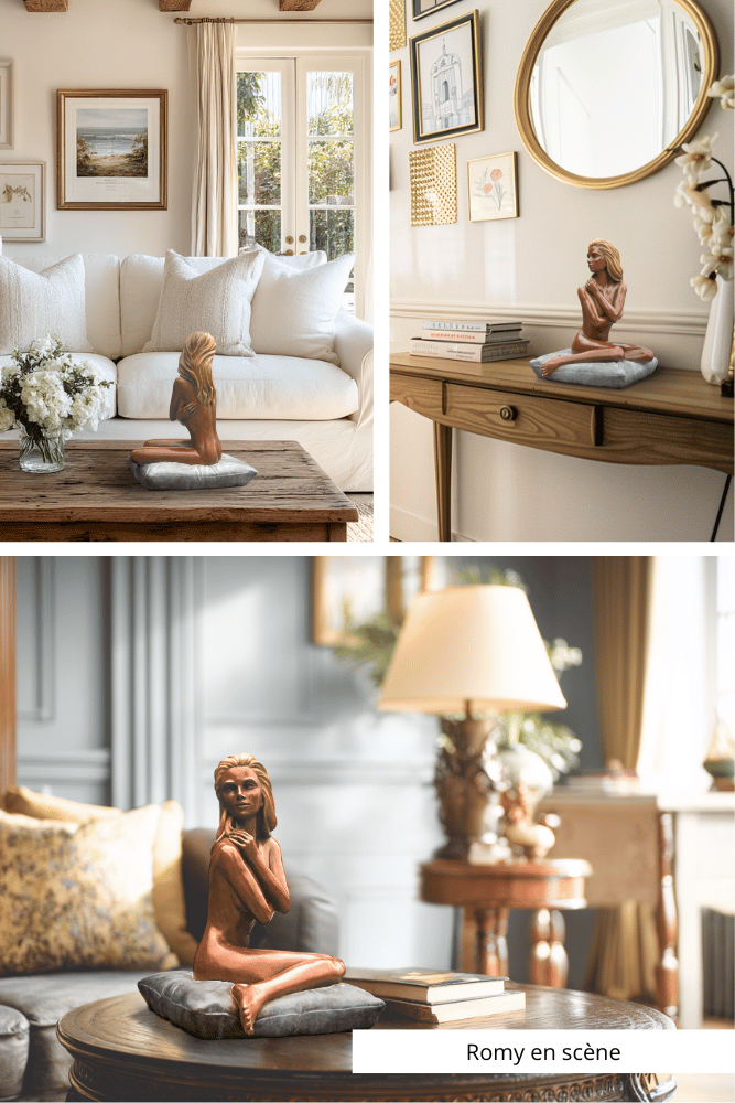 Dans une pièce à vivre, Romy impose une présence discrète. Entre retenue et ouverture, sa présence apaise, interpelle, et semble offrir un pardon silencieux à celui qui la contemple.