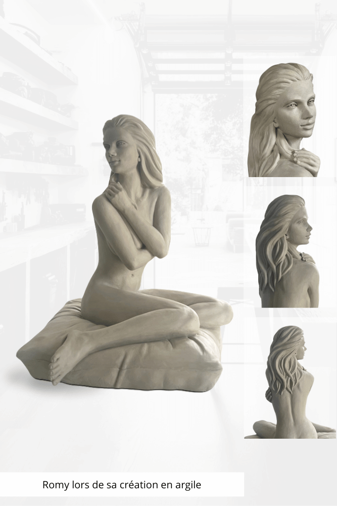 “Romy ne s’est pas révélée d’emblée dans l’argile. J’ai exploré plusieurs attitudes pour trouver l’équilibre entre pudeur et simplicité, afin que son visage porte toute l’émotion que je voulais transmettre.